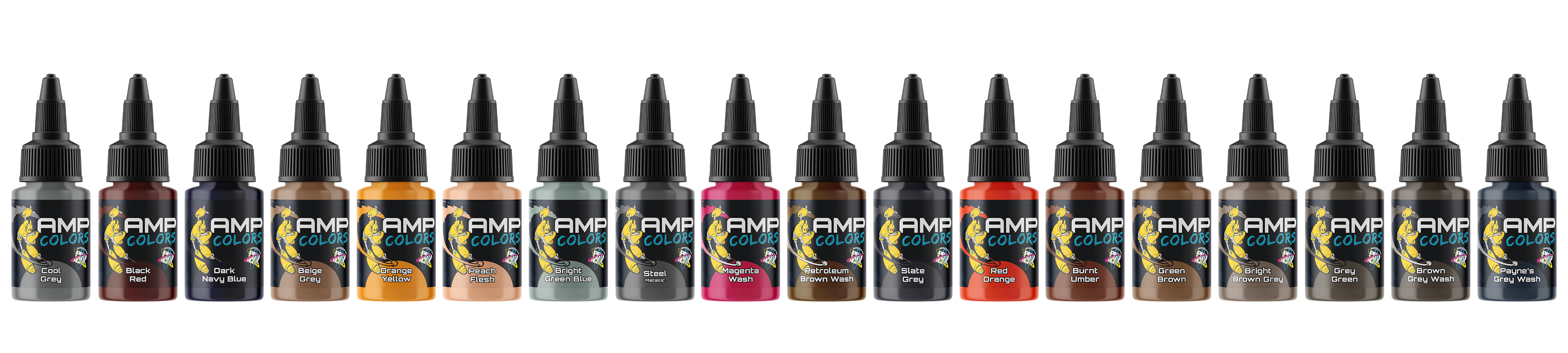 The First Cosmic Paint Set with AMP Colors! This set includes 9 AMP Colors with the same, amazing Pro Acryl quality you know. 22ml bottles Colors include - Cool Grey, Black Red, Dark Navy Blue, Beige Grey, Orange Yellow, Peach Flesh, Bright Green Blue, Magenta Wash, Petroleum Brown Wash